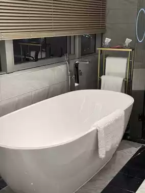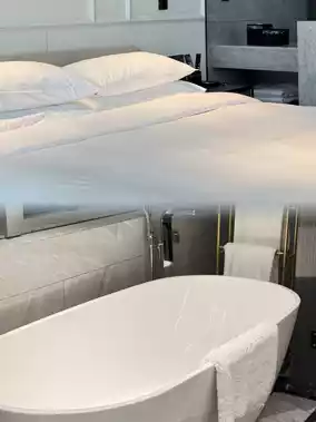 Ceremonial High-altitude Bath Experience: The bathtub is positioned by the window. Pour yourself a glass of wine and gaze down at the city lights through the misty steam—a moment when even time becomes lazy.
