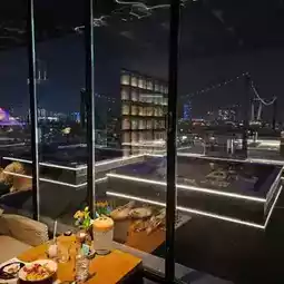 Great restaurant that situated on the 6th floor of the building with an amazing view over the river and city lights. The food is amazing! We had the mushroom risotto, foie gras and grilled meat platter. We also tried different cocktails and although it's small the presentation is great and they taste great. The ambience of the place is beautiful, you can sit outside as well in Summer time or go upstairs to enjoy drinks in the Lounge after dinner.