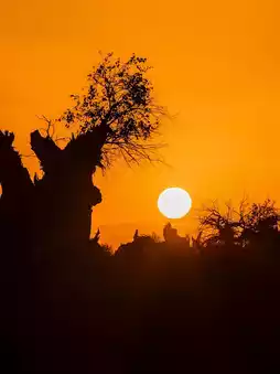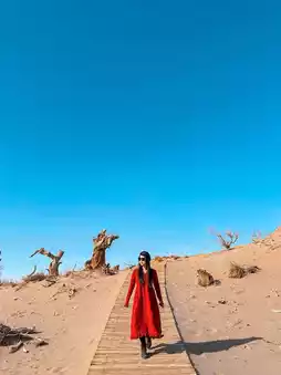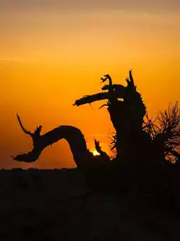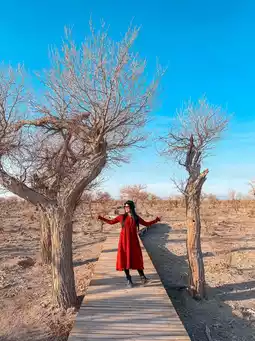 waiting for Xinjiang's first ray of sunlight to sprinkle on this golden poplar forest, letting the wind carry the sand across my cheeks, I close my eyes, listen to the low hum of the wind, and feel the gentle touch of the sand.