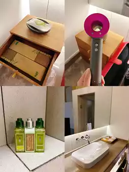 As soon as you enter, the room is really big! There is also a super large massage bathtub with insulation and heating function🛁. Bathing while looking at the scenery outside the window is so comfortable! The bath products are from L'Occitane and there is a Dyson hairdryer.