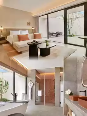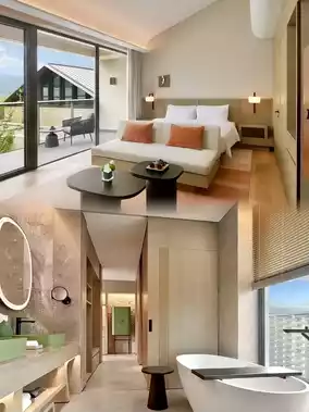 A total of 102 rooms cleverly integrate modern minimalist design concepts into traditional Jiangnan aesthetics, and carefully polish every detail. The basic room is a selected room with an area of 50-57 square meters, a double bed of 2 meters, and the internal layout divides the daily living line appropriately and freely, sleeping area, leisure area, washing area, dry and wet separation area... If you want to live more spacious and comfortable, you can choose Chunjian Yangxian Suite, with double bed/twin bed optional. The room area is 90 square meters, with a separate living room, all with balconies.