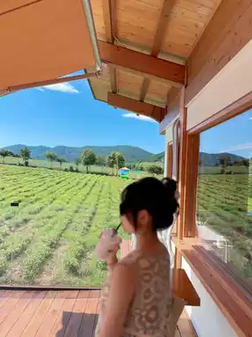 ▪️A cafe with a tea mountain viewing platform, perfect for relaxing, drinking coffee, and looking at the tea garden terraces in the distance, feeling a long-lost sense of relaxation.