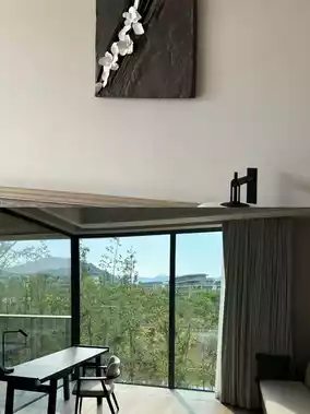 - Space scale: The 90㎡ suite is spacious and transparent, with no new renovation odors, air purifiers running continuously. Upon entering, your view is locked by the "mountain-view floor-to-ceiling windows + extra-large balcony"—the green mountains change with the sunlight. In the morning, you can sit on the balcony to enjoy tea; at night, lie on the sofa and cast your phone screen to watch live streams (a thoughtful design supporting phone casting, beating similarly rated hotels opened in recent years).