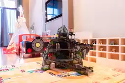 Experience the charm of themed rooms, such as the Dino-themed room, where the fresh yellow-green color scheme creates a bright and lively atmosphere. The soft and adorable Dino bedding features playful expressions and poses, making you smile instantly. Lying on the bed feels like being gently embraced by Dino. Beside the bed, there's a giant plush Dino toy with a chubby body and innocent big eyes, inviting kids to play and share secrets. In the corner, a custom Dino-themed tent awaits, adorned with vivid Dino patterns, where children can unleash their imagination and embark on an adventure.