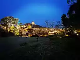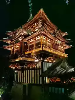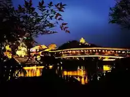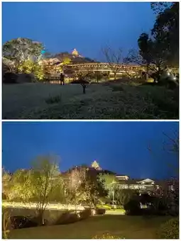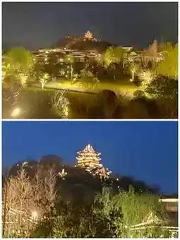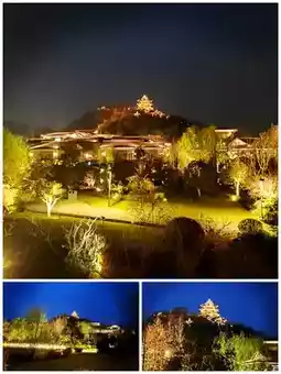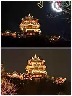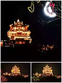 b. Distant shots of Dongpo Pavilion. Near Longyin Xishan Hotel or on a distant hillside, shoot the pavilion as the main subject, capturing its brilliant full view against the night sky, including the surrounding mountains and water, presenting a "heaven on earth" feeling.