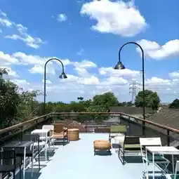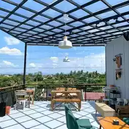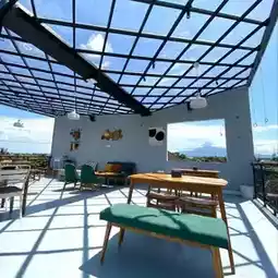 The second area is the rooftop, which is really cool for enjoying the surrounding atmosphere from above. The furniture choices fit well with the concept, and the breeze is gentle. On clear days, you can even see Mount Merapi from afar. Additionally, the atmosphere is calm and not noisy.