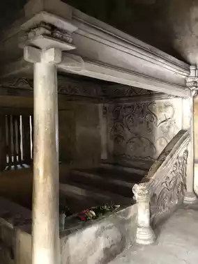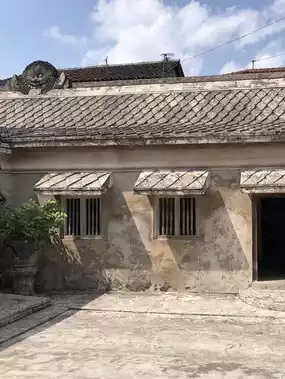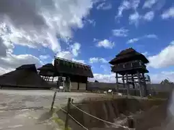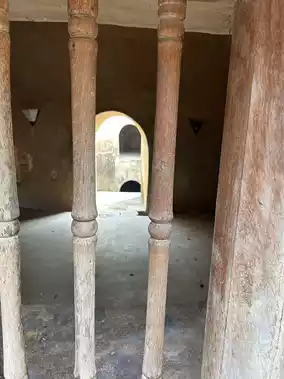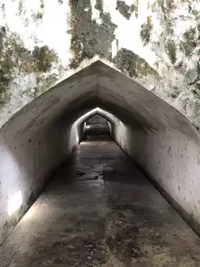 Collapsed due to a major earthquake, many residents used the rubble to build homes, and now several buildings remain within a residential area