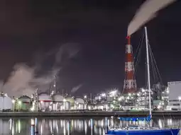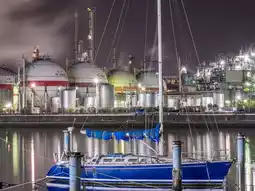 From the seaside promenade, the lights of the factories are reflected on the water, creating a fantastic landscape that looks like a scene from a science fiction movie🌌
