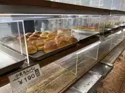 Sweet breads displayed in a case include cream buns and sweet bean buns shaped in simple, nostalgic shapes.