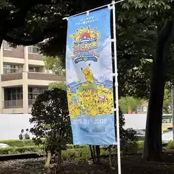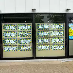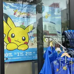 We've introduced Yokohama Stadium, home of the Yokohama Dena Baystars, in the past, but today it has a slightly different atmosphere. That is because it's Pokemon Ballpark Day, a collaboration with Pokemon. Around Yokohama Stadium, Pokemon designs can be seen everywhere, which is different from usual. The exterior of the official shop was also decorated with Pikachu-patterned towels, unlike the usual cheering towels. To top it off, Pikachu sun visors were being distributed to visitors.