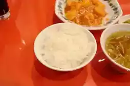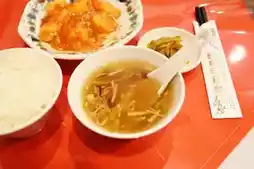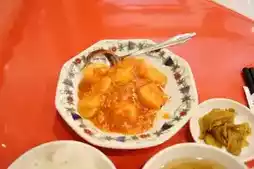I went inside the restaurant and looked at the menu, and there was a Chinese-style set meal with Mapo Tofu as the main dish, shrimp dishes, and soup, so I ordered it right away. The basics were rice, a luxurious soup with scallions, and a shrimp dish with a sour seasoning based on ketchup, which was also good, and even the dessert was delicious... But above all, the Mapo Tofu, which had a much stronger spiciness than what I actually ate in Sichuan, was so appealing. I ate it so deliciously while sweating profusely because of the real Mala taste that I felt after a long time.