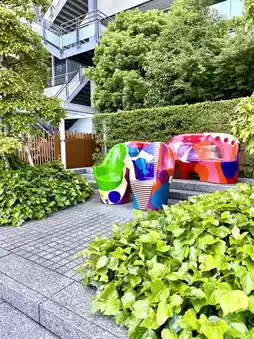 Between the buildings, there's a plaza filled with lush greenery, monuments, and benches, making it a popular spot for people to relax and take a break✨
