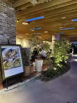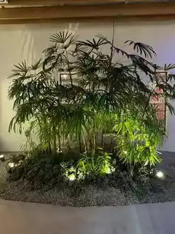 A charming restaurant floor featuring green objects inspired by Mt. Fuji and a bamboo path!