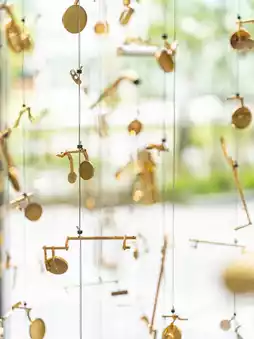 A glittering, gigantic piece of art made from saxophone, trumpet, clarinet, and flute parts.🎶