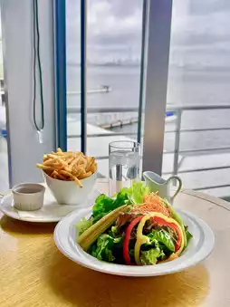 Entering from the main entrance on the first floor, there is a very tall lobby. You can take the escalator to the second floor to check in. Next to the counter is Marine Blue. It is very comfortable to sit here and drink afternoon tea while watching the sea. Since InterContinental Ambassador has 2,000 yen to use, we went to Marine Blue for dinner. We had salad and French fries. I really liked the Japanese dressing on the salad. It was sour and delicious.
