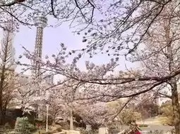 This photo showcases a lovely night vista of weeping cherry tree blossoms (Prunus pendula / ”shidare-zakura” in Japanese) located in Yamashita-Koen Park. The trio of trees can be found adjacent to a large rose garden, situated on the opposite side of the road from the historically renowned Hotel New Grand (established 1927). Depending on your vantage point, you may also be able to include Yokohama Marine Tower in the backdrop of the cherry blossoms.
