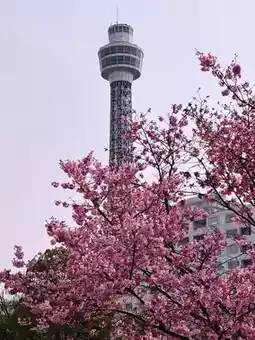 [Yokohama New Grand Hotel and Hikawa Maru with cherry blossoms in full bloom, welcome spring at Yamashita Park]
