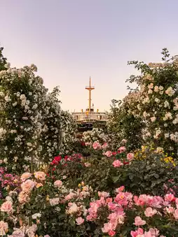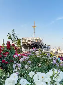 In the background, you can find the "Hikawa Maru," a ship designated as an Important Cultural Property of Japan. The contrast between the ship and the roses makes it a popular photo spot.