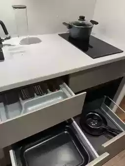 The kitchen is equipped with an induction stove, refrigerator, and microwave. It is fully equipped with pots, pans, dishes, and cutlery, so you can cook your own meals. You can cook the ingredients you bought at the nearby supermarket or convenience store. There are Family Mart and 7-Eleven convenience stores nearby, which are convenient.