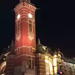 A 36-meter-tall clock tower. It is lit up at night, creating a fantastic atmosphere.