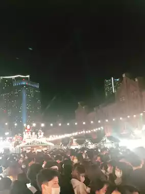 A gigantic 10-meter-tall Christmas tree was illuminated with approximately 20,000 LED lights, and the illuminated roof, spanning over 50 meters, created a magical atmosphere, making it seem as if you were walking under a starry sky. 58 stalls lined the venue, offering a variety of German Christmas items, including mulled wine, sausages, and ornaments.