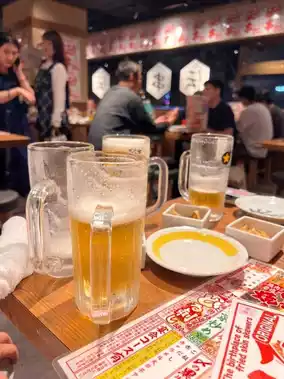 As soon as we got off the plane, we stayed in the Shin Yokohama area for the first night. The atmosphere was so chill! 🌙 At night, I wanted a light drink, so I found a cool local spot called Shinjidai! 🍺 The highlight was a large glass of ice-cold Sapporo draft beer for just around 40 baht! Honestly, it was a great deal! 😍 The best snack was the crispy fried chicken skin, so delicious I couldn't stop. I also ordered the cabbage with salt sauce to cut through the richness. It was truly Japanese.