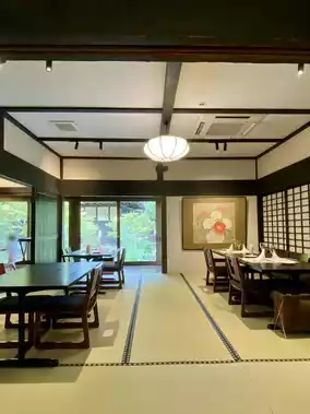 The interior beautifully blends Japanese and Western aesthetics, featuring traditional wooden beams and soft lighting that create a warm, elegant atmosphere. Here, French cuisine is enjoyed with chopsticks, which adds a relaxed and uniquely Japanese touch to the fine dining experience.