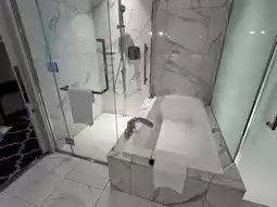 The chic monochrome interior gave the room a refined, contemporary feel—stylish without being overly formal. Floor-to-ceiling windows let in plenty of natural light and offered a sweeping view of the city and harbor.