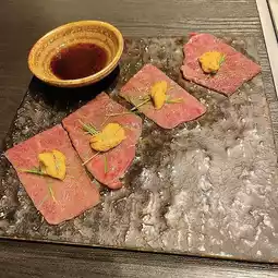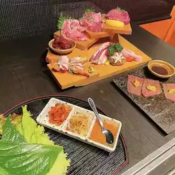 Assorted appetizers, Kochori salad, sea urchin loin, black wagyu beef staircase (tongue steak, top skirt steak, secret kalbi, premium kalbi, samgyeopsal, pork shiso wrapped shrimp), wakame soup, beef tendon curry, dessert (almond tofu), and I also ordered green onion tongue salt!