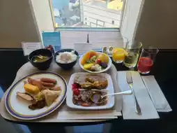 The next morning, I wake up to a view of Yokohama's Landmark Tower in the distance. Breakfast includes local specialties like Navy Curry, a variety of fruits, and other delicious menu items.