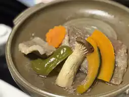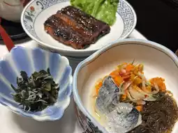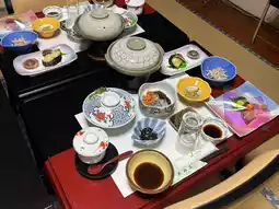 Dinner was delicious, with sashimi, stir-fried burdock, clam chawanmushi, fish dishes, beef teppanyaki, and taro roe soup. 😋