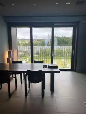 We stayed in a room on the second floor of the building called "Haru." The "Haru" rooms feature a terrace living area that feels like you're spending time by the seaside. Stepping out onto the terrace, you'll find a large sofa spacious enough for an adult man to comfortably lie down.
