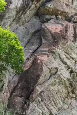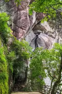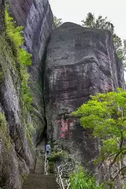 Upon entering the scenic area, the steep Danxia cliffs come into view. The words 'Peach Blossom Cave Entrance' are carved into the cliff, transporting you to the 'Peach Blossom Spring' described by the poet Tao Yuanming.