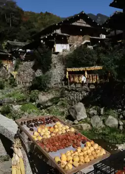 Once inside, I understood. The houses and homestays built along the creek are arranged in an orderly manner, with a unique charm. The autumn harvest items are arranged with great care, with peppers, corn, persimmons, and more, all full of the flavor of autumn. Any random photo taken here is very photogenic.