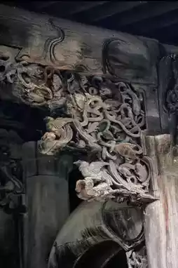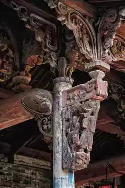 Remarkably, the mottled gold-trimmed red and blue carvings in the ancestral hall remain unrestored, still bearing the marks of time.