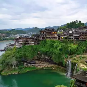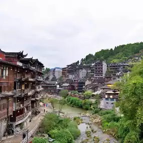 Another ancient city that received a 4A crown is no less amazing. 'Fu Rongzhen' is a village located on the banks of the Xianghe River. There is a large waterfall that cuts through the middle as the local hero. Along with Chinese-style houses around that have been renovated and well-preserved as if we had traveled back in time 2,000 years ago, which was during the Han Dynasty. These buildings are densely interspersed along the hillsides. The alleys are full of shops, accommodations, and restaurants with chic themes. At night, they turn on orange lights to cast a warm aura throughout the valley. And it will be even more amazing if you book in November when the trees will turn into vibrant colors. But if you want a fairy-tale feel, come and see it during the New Year's snow season.