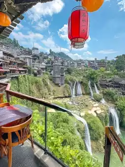 What makes it special is how the ancient Tujia stilt houses and old stone paths sit right beside and above the falls — so you can hear and see the rushing water as you explore the town. At night, the waterfall is often lit up, creating a magical scene with mist and colorful lights.