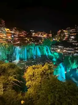 At night, the Furong Waterfall becomes even more magical and iconic. Powerful spotlights and soft lanterns light up the 60-meter-high waterfall as it cascades down the cliffs right through the ancient Furong Village. The stilted wooden houses and stone paths around it glow with warm lights, and mist from the waterfall mixes with the colored lights, creating a dreamy, fairy-tale scene.