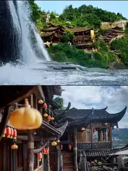 Chuwang Palace Babutang (pl): Stand on the plank road to overlook the waterfall and ancient town.