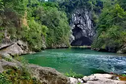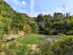 There are many places with natural bridges, and here is a village in Yongshun County that is named directly after its natural stone bridge, called "Zishengqiao Village." The village is located by the Shi River, in the river section between Diaojing Township and Laosicheng. The Shi River passes through the natural bridge here, and not far downstream is the Siliu Waterfall. A few kilometers further downstream is Laosicheng. Continuing downstream, you will reach the Mengdong River rafting area. This small river is definitely a scenic river. Back to the point, the natural bridge in Zishengqiao Village is 50 meters wide, 30 meters high, and 80 meters long. After flowing over a small shoal, the river water enters the cave of the natural bridge and flows out about 80 meters later from the other end of the bridge. At the entrance of the cave, the incoming sand has accumulated into a small sand island that can accommodate dozens of people. This place is only about a 40-minute drive from Yongshun County town and is a great spot to cool off in the summer. On hot summer days, many people drive here. There is a small simple parking lot on the shore that can squeeze in about 10 cars. From the parking lot, stone steps lead down to the riverbank. Many people are playing in the water by the river. A small wooden boat carries tourists to the small sand island inside the cave, where there are already quite a few people, estimated to be about 30 to 40. They are having a picnic there. Outside the cave, the sun is blazing, but inside the cave, a cool breeze blows, making it a perfect place to seek refuge. On the high ground to the right of the main cave, there is another natural bridge arch, but it is higher and has no water. I think maybe the river used to flow through there, but later the riverbed cut down and changed course to the current waterway, forming the new natural bridge (just a guess). The road into Zishengqiao Village crosses over the natural bridge here and continues along the riverside road downstream. The left bank road ends at Hejiaping, and the right bank road ends at Shanghe Village group. Further downstream, you can only travel by water. If you get a small inflatable boat to drift down, it would definitely be interesting. You can drift to Siliu Waterfall and also to Laosicheng.