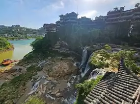 Located on a high cliff amidst the mountains, the village stretches above the "Furong Waterfall," which cascades nearly 60 meters down to the river below. 💦 The mist from the waterfall catches the afternoon sunlight, creating a dazzling sparkle that takes your breath away! It's no wonder this place has been rated as a 4A-level tourist attraction in China. 🇨🇳