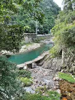 The river meanders along the way, the stones are covered with moss, and the trees are lush