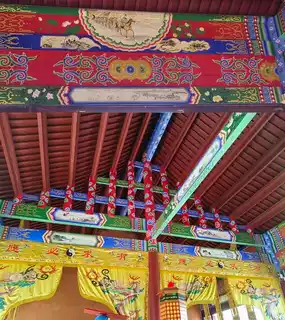 The main hall of the Wumiao faces west, with a width of five bays and a depth of three bays. The architecture features a double-eaved Xieshan-style high platform with a fenced enclosure, red walls, and green tiles, with high-flying wing corners. A treasure gourd is erected in the center of the main hall, with large beast masks installed at both ends, and fish-shaped masks on the other eave corners. Wind boards and hanging fish are placed on the two slopes.