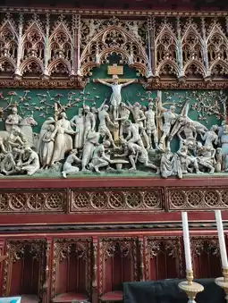 Inside York Minster, amidst the towering stone and stained glass, a corner glows with colour and reverence. A golden frame catches the eye—ornate, gleaming, inscribed with the name John Edward, Dean of the Cathedral. It stands not alone, but surrounded by symbols of devotion: a crimson cloth draped with care, a cross positioned in quiet dignity, and paintings that echo centuries of faith and artistry.