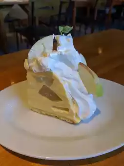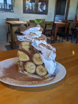 The signature menu item, the Monomiyagura Tart, is available in a variety of flavors, including seasonal fruits and the standard banana flavor.