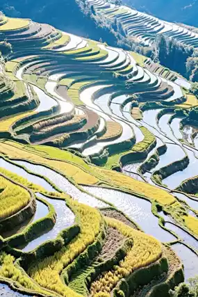 But it is autumn that truly captivates the soul. The rice ears ripen into a heavy, golden expanse, like thick oil paint lavishly splashed across the landscape! Every rise and fall of the mountains, every tiny paddy, swells with the weight of gold. When the wind blows, the rice sways like waves, golden ripples filling the valley; when the wind stills, the entire ridge seems stitched with an immense golden velvet cloth—a majestic robe the earth dons to crown its own abundance! Here, Hani farmers bend and toil, their indigo headscarves moving like brushstrokes across the boundless gold, their figures tiny as ants yet the very strokes that complete this masterpiece—a delicate fusion of nature's grandeur and human labor. The land, solid and enduring, bears the burden of life, while its generous belly silently nourishes the flames of human existence.