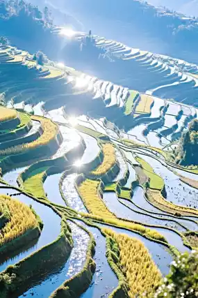 The beauty of the terraces lies in their playful dance with sunlight and clouds, changing their attire with the seasons. In early spring, when the fields are brimming with water, each level holds a clear pool, the surfaces smooth and mirror-like, as if shattered fragments of glass were scattered across the valley. When sunlight pours down, the water shimmers with countless silver scales—where the ridges twist and turn, the interplay of light and shadow resembles molten metal flowing slowly through the mountain valleys. The narrow, winding paths between the terraces are like the earth's fine wrinkles, silently bearing the weight of millennia of toil, whispering wordlessly to the sky.