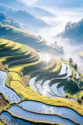When the first light of dawn tints the sky and thin mist wraps the valley like a soft, milky silk ribbon, the undulating mountains awaken—amid the serpentine, winding ridges, the gentle curves of Yuanyang's terraced fields emerge layer by layer. Carved meticulously over centuries by the blades of cultivation, these vast terraces follow the mountain's contours, climbing from low to high until they touch the clouds, like a colossal tattoo resting upon the spine of the earth. Under the morning light, the shadows and highlights gradually define themselves, the curves of the field ridges as tender as water, as if smoothed and traced stroke by stroke by divine hands.