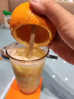 There is an orange tree at the entrance of the store, and there are other orange trees in different corners of the store for decoration. The staff wears a citrus-shaped hat on their heads, and the menu also uses an orange cover