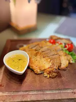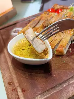 The pork chop is caramelized to a golden brown, and cutting into it releases lots of juice🍖! Paired with the sauce, it’s very flavorful, a perfect match